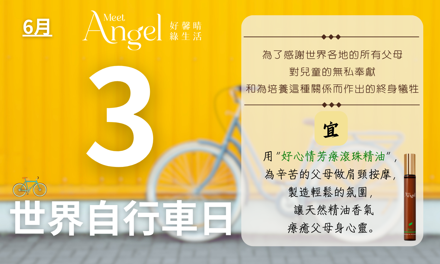 .建議行動: 在騎上自行車之前,先為自己或家人抹上MeetAngel舒緩安定隨身芳療滾珠精油─有助預防抽筋、減少運動傷害,大大提升騎車敏捷度。