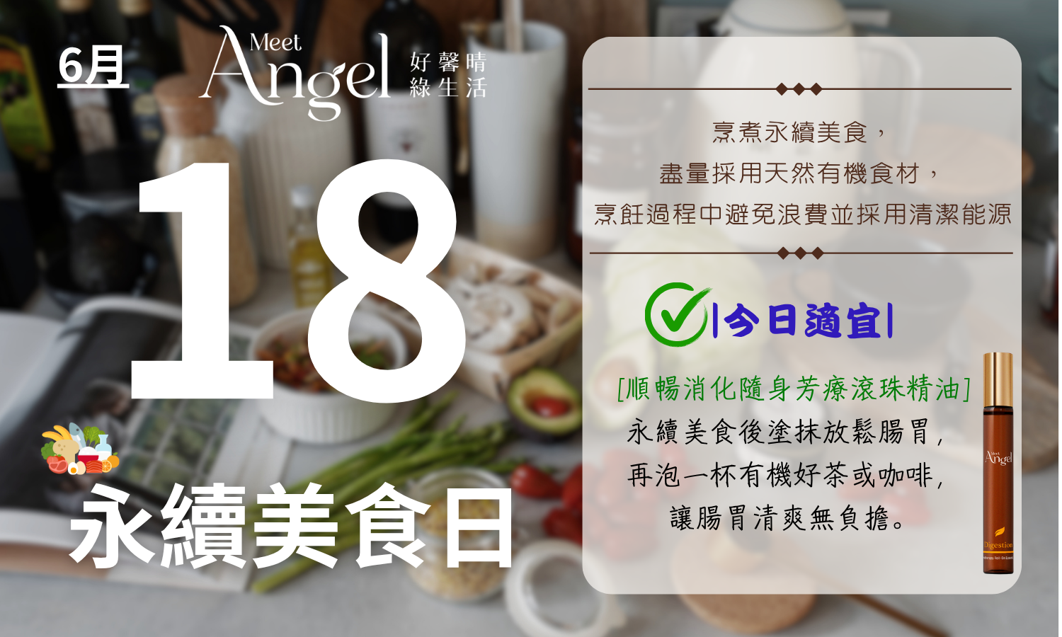 .建議行動: 享受美食後,用MeetAngel順暢消化隨身芳療滾珠精油─放鬆自己的腸胃,並配上一杯有機好茶或咖啡,搭配永續美食,讓腸胃清爽無負擔。