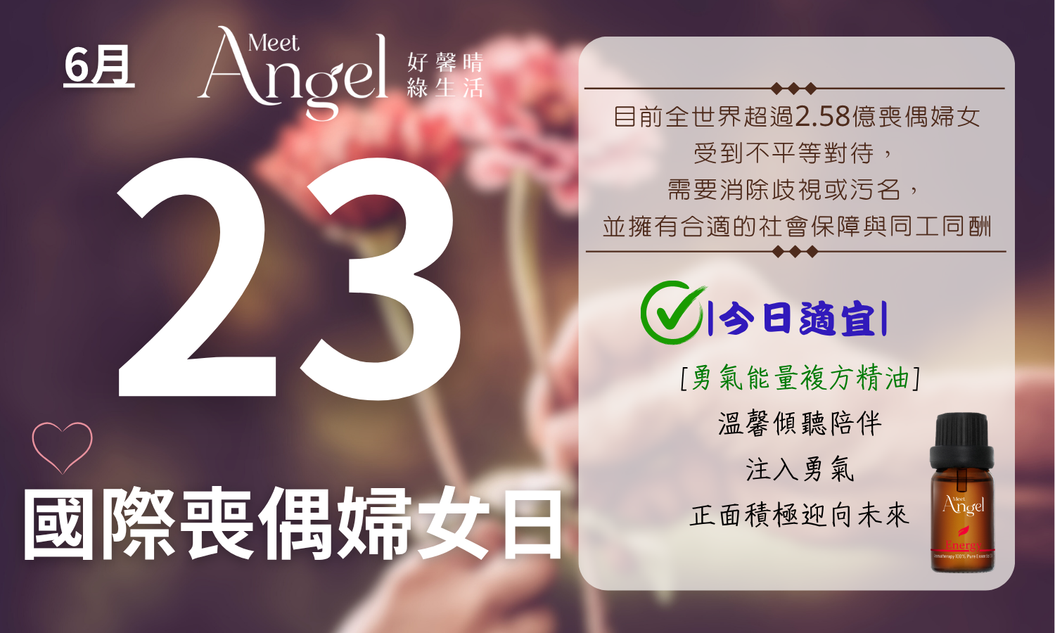 .建議行動: 如果能夠,請安靜傾聽喪偶婦女朋友的心聲;和天然芳療一樣,無聲地、靜靜地溫柔陪伴著。如果她的確遭遇許許多多的無形社會與工作壓力,除了溫馨陪伴,也請利用勇氣能量複方精油,幫她注入勇氣,給予正向能量的支持。