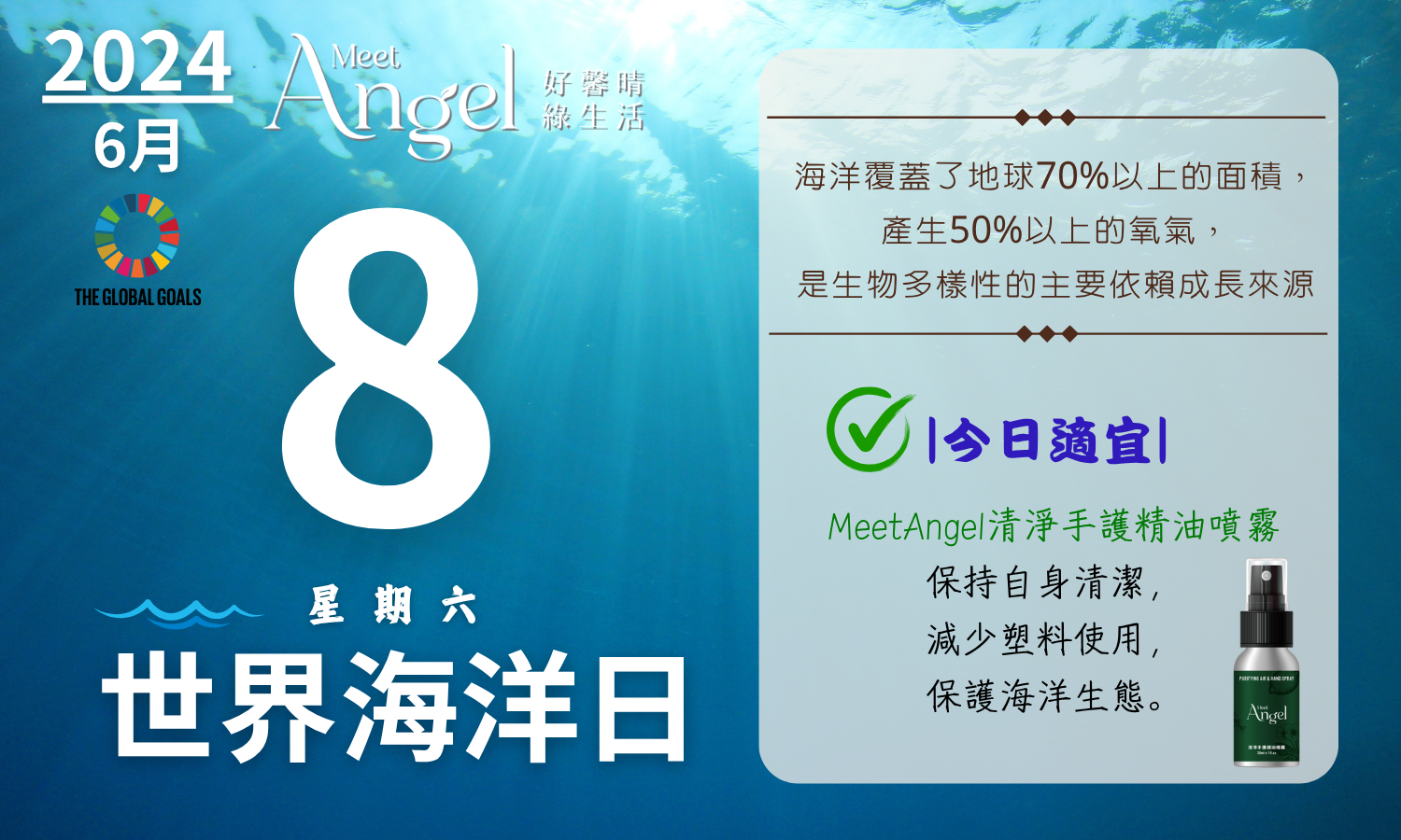.建議行動: 除了主動參與公司與環保團體舉辦的淨灘或海洋保育活動之外,可以採用MeetAngel清淨手護精油噴霧來保持您自身清潔,同時採用了FSC 100% 再生源綠能紙環保盒裝,減少塑料使用機會,保護海洋生態。