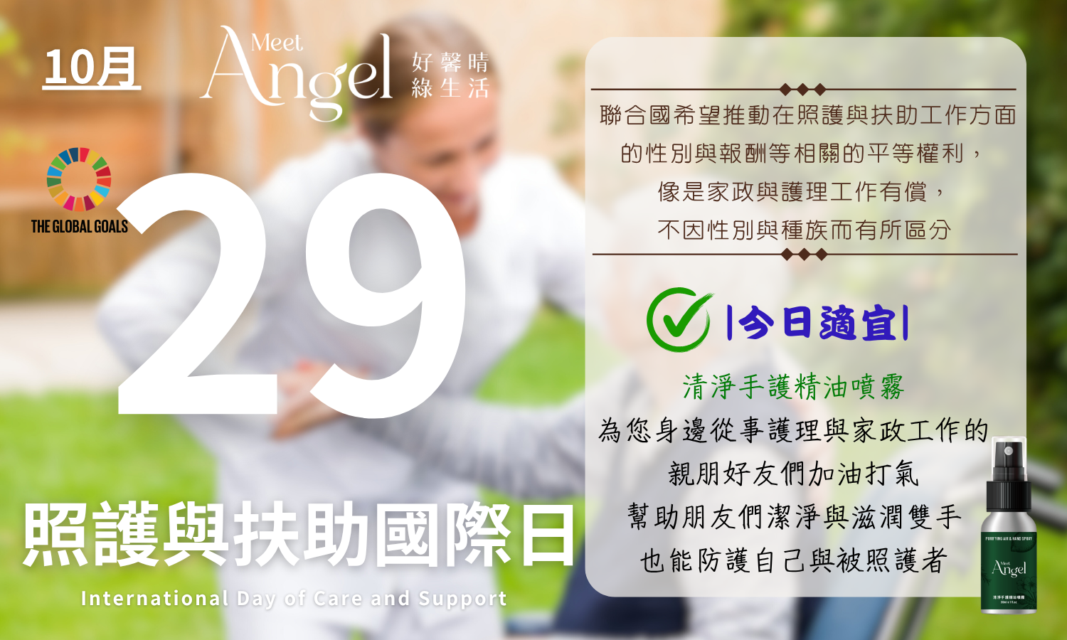 建議行動:為您身邊從事護理與家政工作的親朋好友們加油打氣,送他們一瓶「MeetAngel清淨手護精油噴霧」。其中特選來自花東頂級珍貴的印加果油成分,富含維生素E及Omega-3、6、9 健康潤澤肌膚;能夠幫助朋友們潔淨與滋潤雙手,也能防護自己與被照護者。