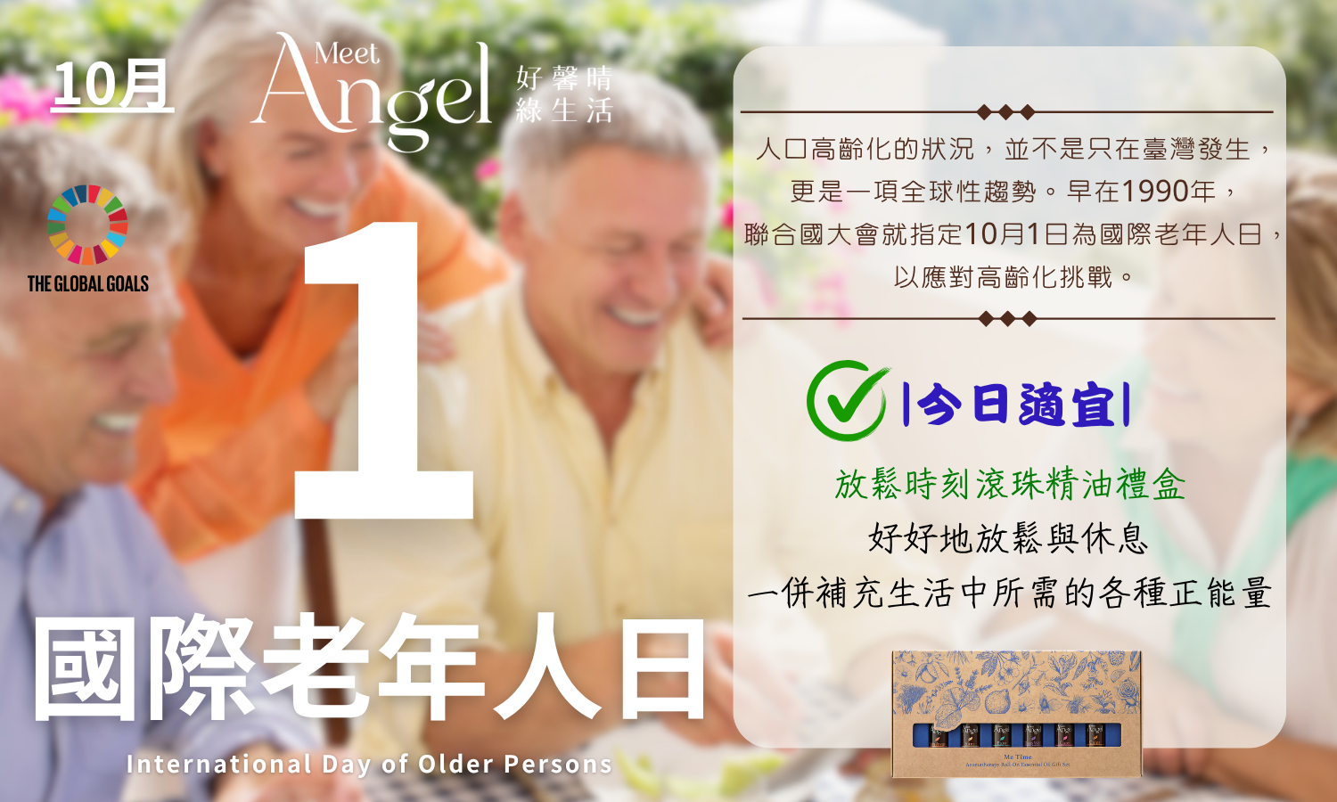 建議行動:對於您身邊已邁入高齡者行列的親友,請多加利用「MeetAngel放鬆時刻芳療滾珠精油禮盒」裡的6種不同香味精油,好好地放鬆與休息,一併補充生活中所需的各種正能量。