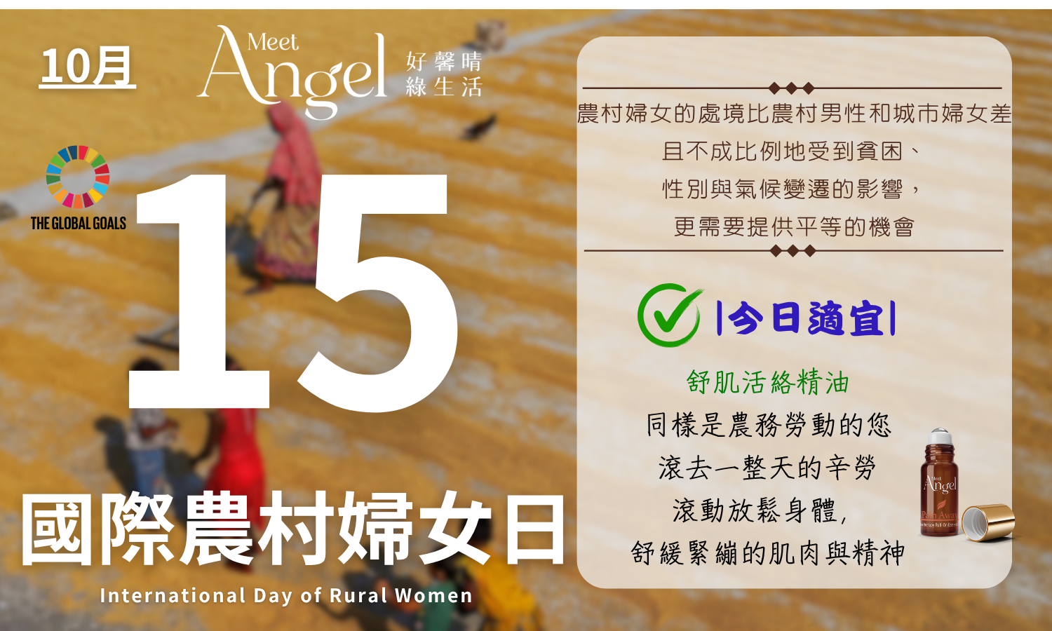 建議行動:針對在農村投注心力的婦女朋友,甚或同樣是農務勞動的您,記得以「MeetAngel PainAway舒肌活絡精油」,滾去一整天的辛勞,滾動放鬆身體,以舒緩緊繃的肌肉與精神。