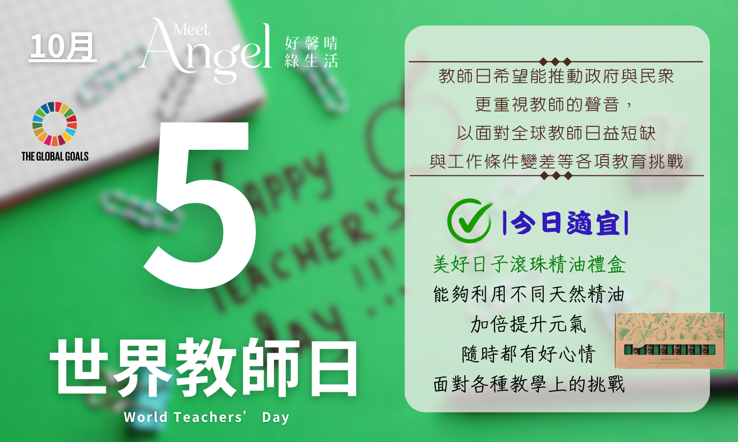 建議行動:為您身邊的老師們,送上一盒「美好日子芳療滾珠精油禮盒」。幫助他們在忙碌的教學與行政事務之餘,能夠利用不同天然精油,加倍提升元氣。隨時都有好心情,面對各種教學上的挑戰。