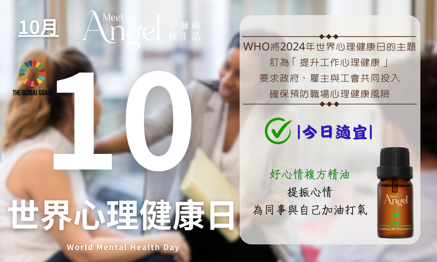 建議行動:請多關心職場身邊的同事、主管與客戶們,甚或是您本身的心情狀態。遇到低潮時,找出隨身攜帶的「MeetAngel Joy好心情精油」,提振心情,為同事與自己加油打氣。