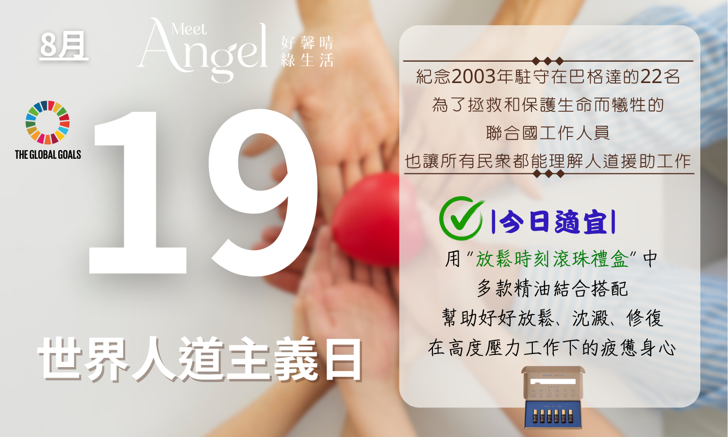 意涵: 在臺灣並不是十分熟悉的世界人道主義日,有著一個令人悲傷的起源。2003年8月19日,伊拉克首都巴格達一家飯店遭到炸彈攻擊,造成聯合國駐守當地的22名人道援助工作人員死亡。為了紀念這群為了拯救和保護生命而犧牲的工作人員,聯合國在2008年將8月19日訂為世界人道主義日,希望讓所有民眾都能理解並協助推動困難又危險的人道援助工作,包括維護受難民眾生命,與提供基本生活必需品等救援行動。
