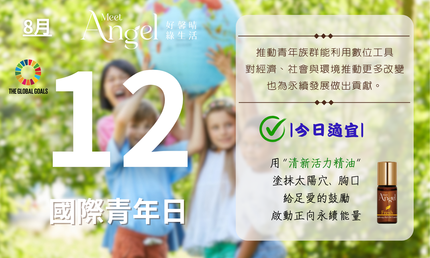 也請貼心的您,記得經常提醒青年朋友們,在早上一甦醒,上班上學之前,身體逐漸活動開來的時候,可以利用 「MeetAngel清新活力精油 Fresh」,在自己的鼻側、太陽穴、耳後或胸口輕輕地均勻滾動,賦予清新活力,來迎接全新美好的一天。