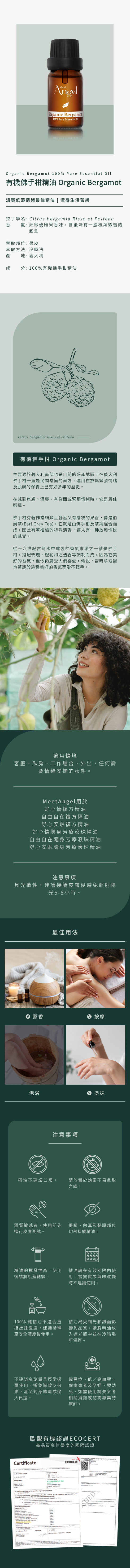 有機佛手柑起源於意大利南部也是目前的盛產地區,佛手柑在義大利一直是民間常備的藥方,運用在放鬆緊張情緒及肌膚的保養上已有好多年歷史。在感到焦慮,沮喪,有負面或緊張情緒時的最佳選擇。