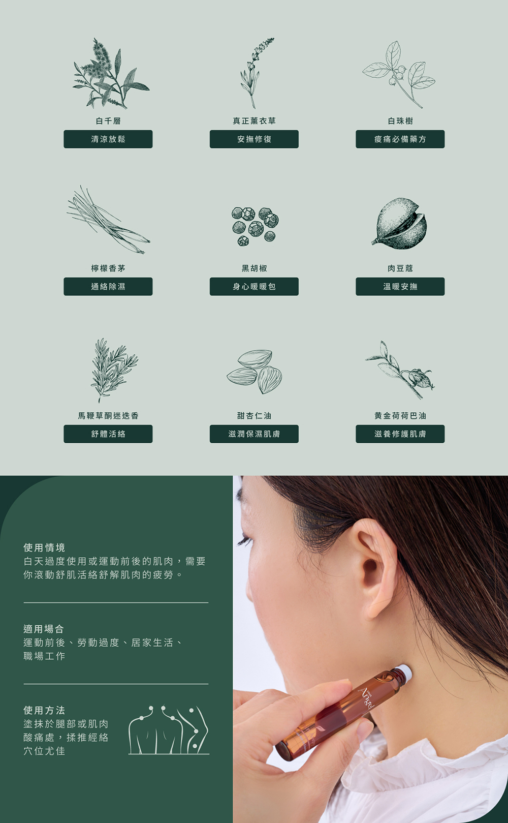 疲累的生活與壓力所帶來身體酸痛,舒肌活絡解開一整天跟著你操勞緊繃酸痛的筋骨。