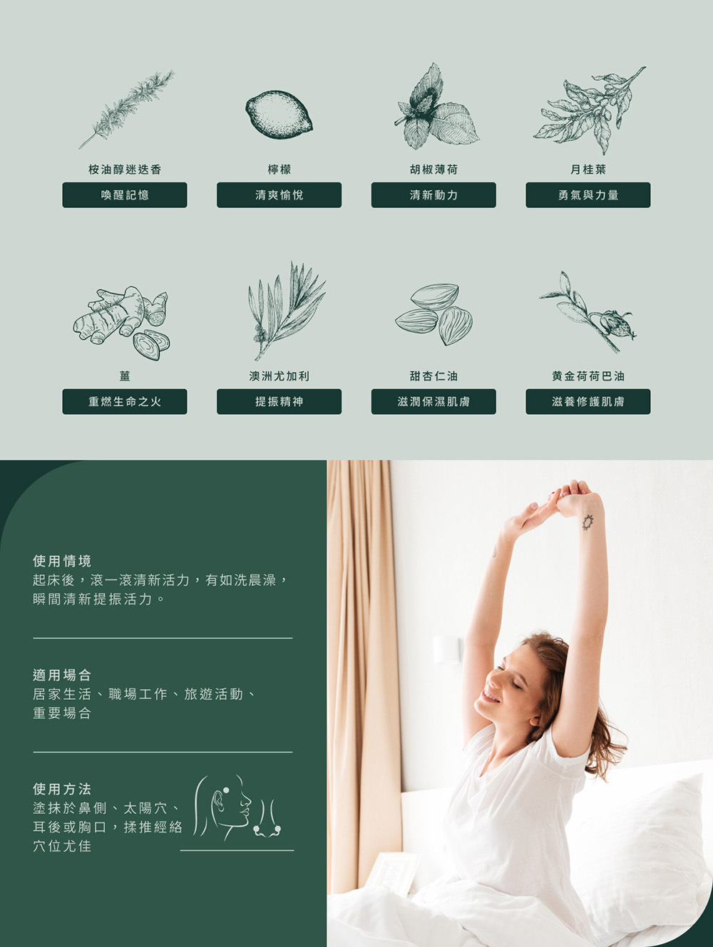 甦醒,啟動身體時,滾動清新活力,大口呼吸感恩自已的身體,歡心迎接全新美好的一天。