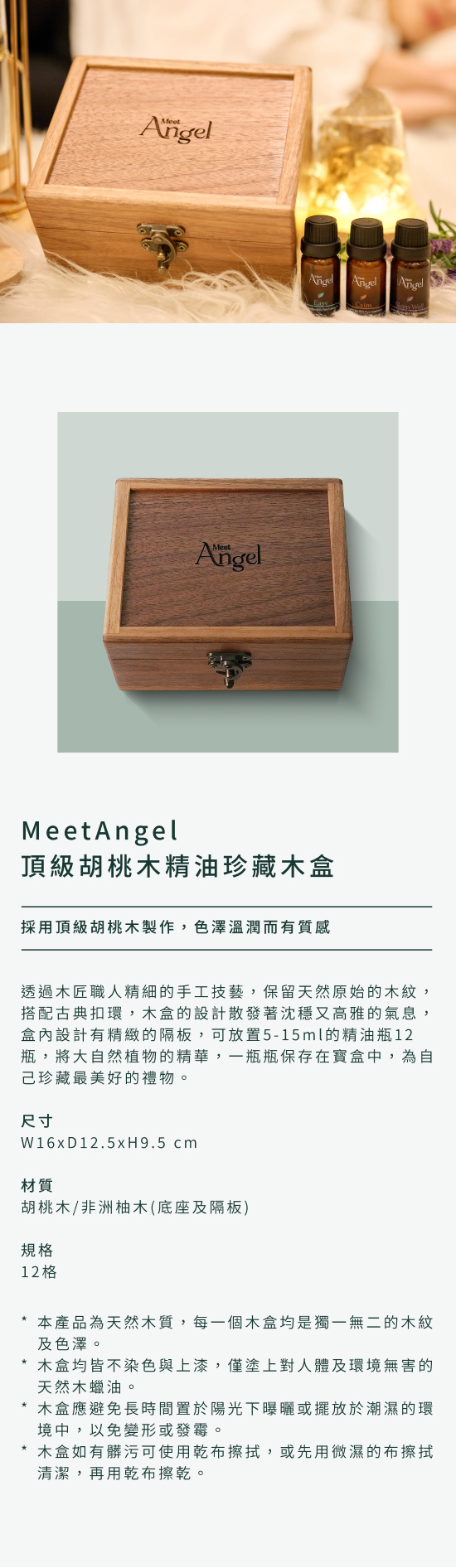 採用頂級胡桃木製作,色澤溫潤而有質感。透過木匠職人精細的手工技藝,保留天然原始的木紋,搭配古典扣環,木盒的設計散發著沈穩又高雅的氣息, 盒內設計有精緻的隔板,可放置5-15ml的精油瓶12瓶,將大自然植物的精華,一瓶瓶保存在寳盒中,為自己珍藏最美好的禮物。