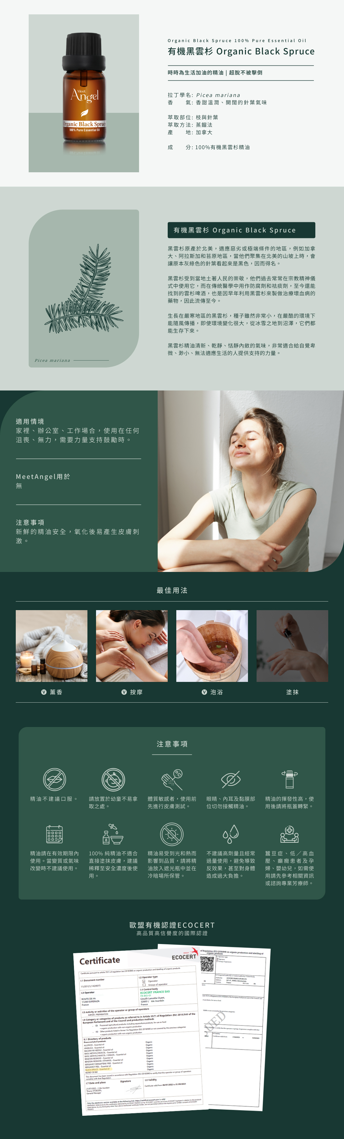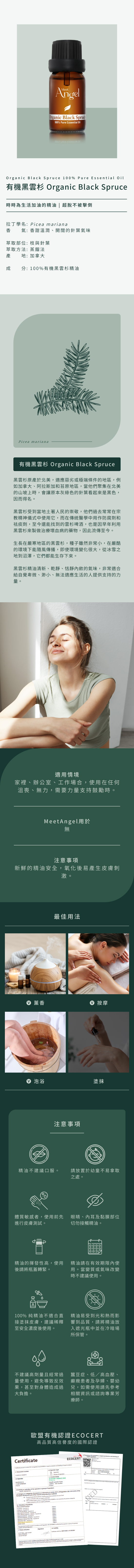 黑雲杉精油清新,乾淨,恬靜內斂的氣味,非常適合給自覺卑微,渺小,無法適應生活的人提供支持的力量。